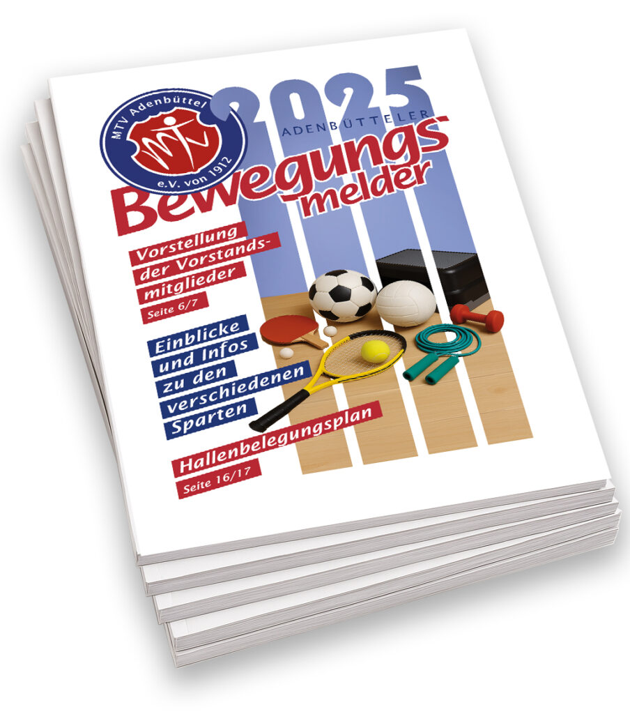 Somit erfüllt es uns mit großer Freude, die Premieren-Ausgabe unserer kostenlosen Vereinszeitschrift „Adenbütteler Bewegungsmelder“ zu präsentieren. In der ersten Ausgabe stellt sich der geschäftsführende Vorstand persönlich vor – mit seinen Visionen, Zielen und dem, was ihn antreibt. Gleichzeitig geben wir detaillierte Einblicke in jede einzelne Sparte, um zu zeigen, wer hinter dem vielfältigen Vereinsleben steht. Wir werden den Bewegungsmelder ab August 2025 überall im Dorf auslegen – falls Euch keine Ausgabe erreicht, erhaltet Ihr Euer Exemplar gerne direkt beim MTV. Zukünftig wird der Bewegungsmelder voraussichtlich zweimal im Jahr erscheinen und über das Vereinsleben, neue Angebote und besondere Highlights informieren.