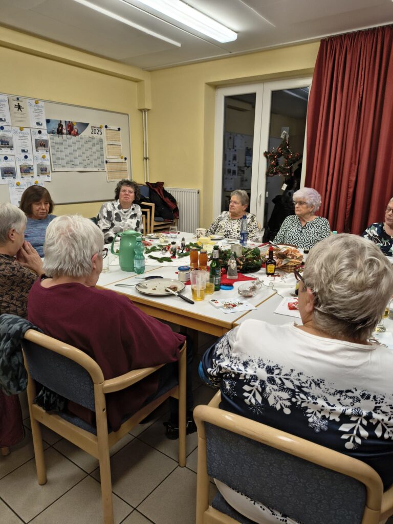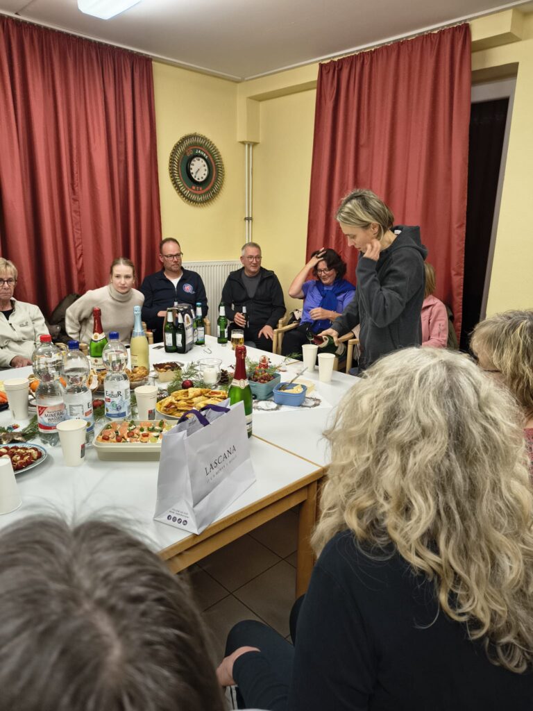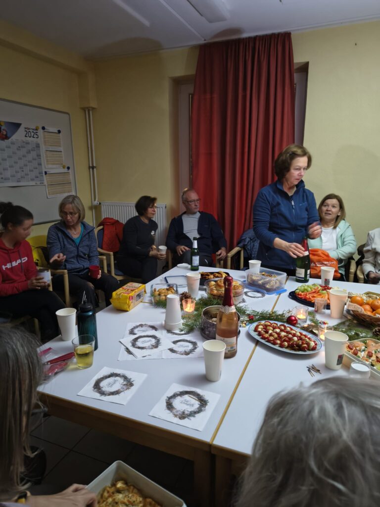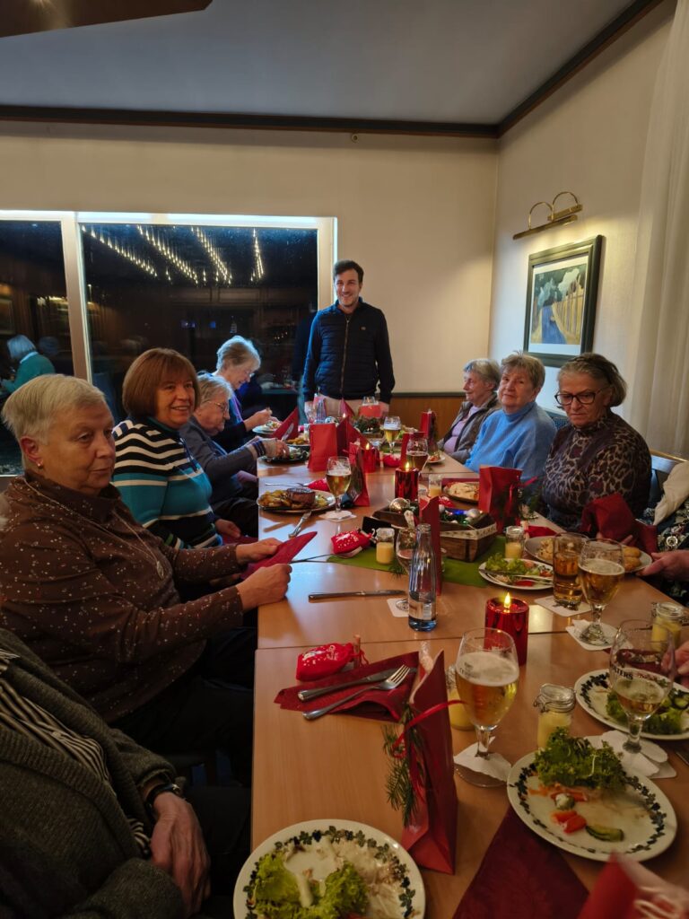 Zwischen Getränken und dem Essen richteten Sonja Müller und Geschäftsführer Michael Horst die Grüße des Vorstands aus, überreichten die kleinen Präsente und wünschten frohe Weihnachten und einen guten Rutsch in ein gesundes 2026 mit weiterhin viel Spaß an der Hockergymnastik.